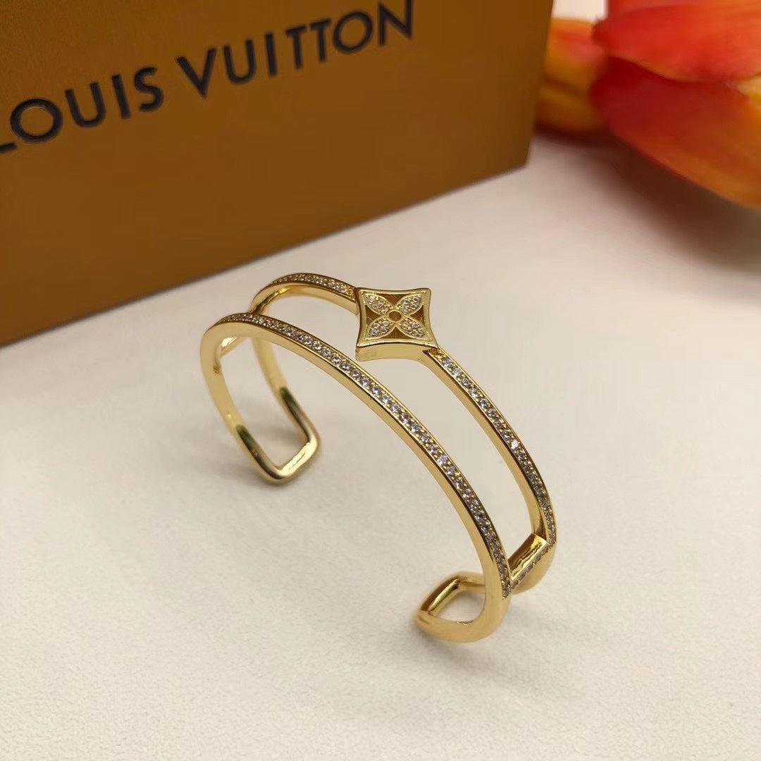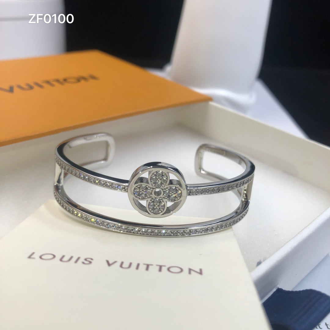 This Idylle Blossom bracelet is fashioned from 18-karat white gold/silver/pink gold. fully paved with brilliant diamonds and set with a diamond-encrusted Monogram Flower. The double-row design looks chic and contemporary – like two bracelets stacked together. This sleek cuff combines stylishly with other jewels from the range. for a modern way to wear diamonds every day.